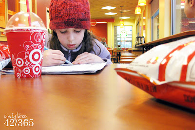 February 11, 2009Moya is doing homework in the Target cafe. We are between her orthodontist appointment and piano lesson...it would take too long to go home and come back, so we are improvising.